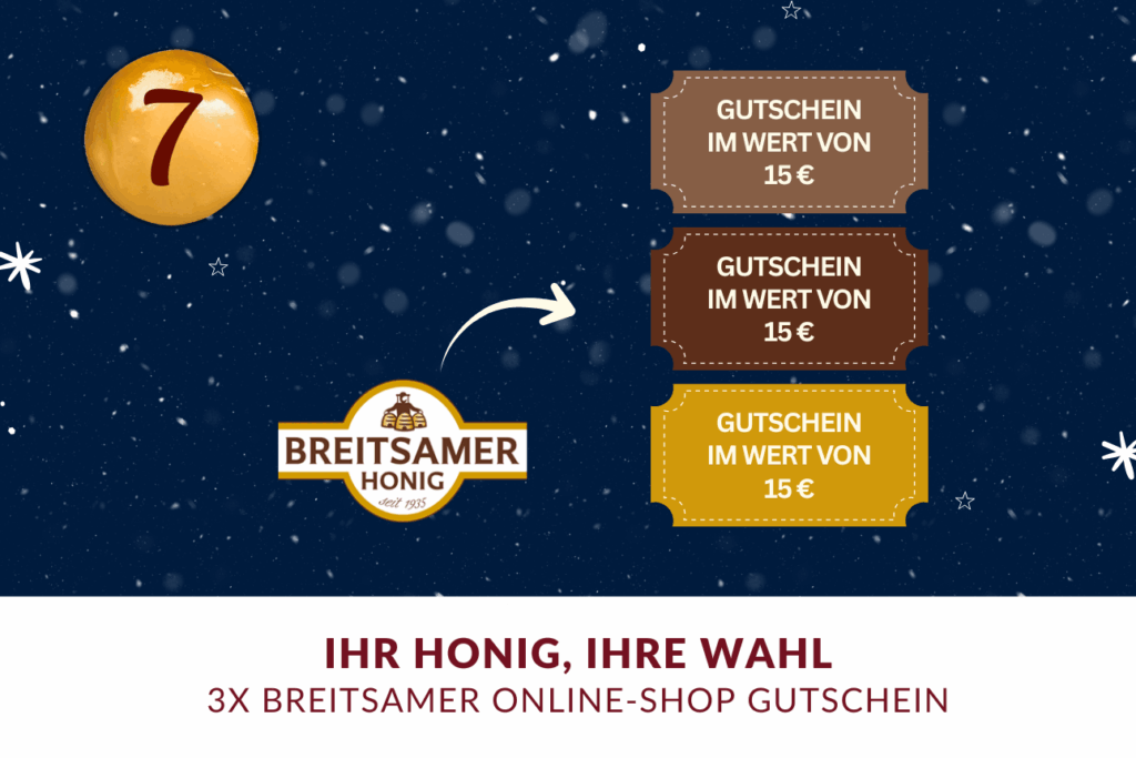Am siebten Tag unseres Adventskalenders dürfen Sie sich über besondere Genussmomente freuen: Wir verlosen drei Gutscheine im Wert von je 15 € für unseren Breitsamer Online-Shop, mit denen Sie Ihre Lieblingshonige entdecken können.