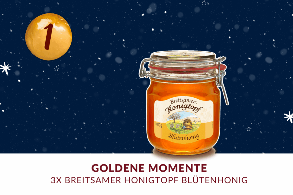 Der Advent beginnt und wir möchten Ihnen die Zeit bis Weihnachten mit besonderen Genussmomenten versüßen. Unser erstes Gewinnspiel startet mit einem Klassiker: dem flüssigen Honigtopf Blüte – 1 kg feinster Blütenhonig.