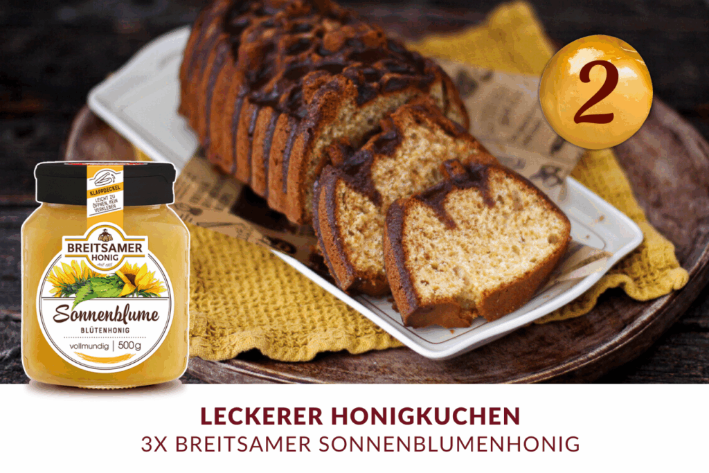 Am zweiten Tag unseres Adventskalenders duftet es nach süßem Honigkuchen. Mit unserem Rezept gelingt Ihnen ein besonders saftiger Kuchen. Der Breitsamer Sonnenblumenhonig sorgt sowohl im Teig als auch in der Glasur für das besondere Extra. Im Teig macht der Honig den Kuchen wunderbar weich und saftig, während die Honig-Zimt-Glasur ihm einen goldenen Glanz und eine süße, aromatische Kruste verleiht.