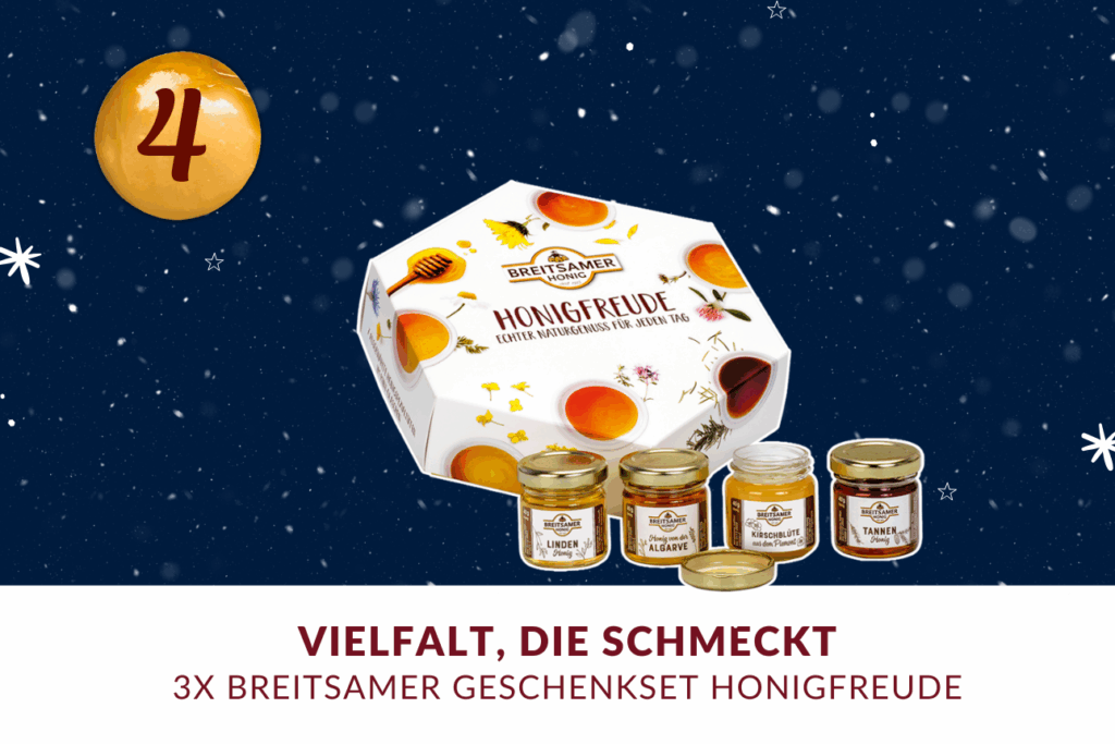 Am heutigen Tag dürfen Sie sich auf unser exklusives Breitsamer Geschenk-Set „Honigfreude“ freuen. Es enthält sieben ausgewählte Honig-Spezialitäten à 40 g, die alle traditionell geimkert, von ausgesuchter Qualität und schonend abgefüllt sind.