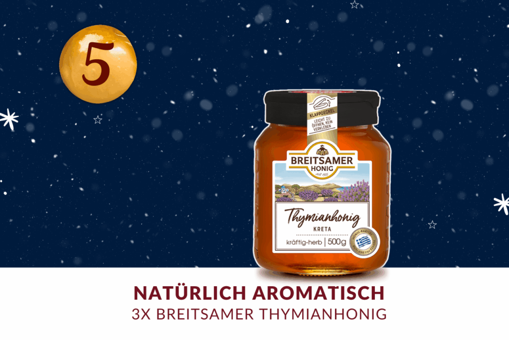 Am fünften Tag unseres Adventskalenders dürfen Sie sich auf den besonderen Geschmack unseres Breitsamer Thymianhonigs freuen.