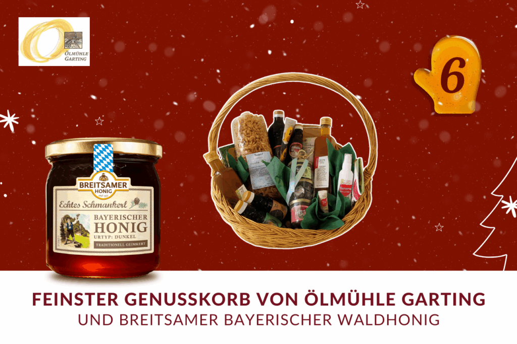 Am sechsten Tag unseres Adventskalenders erwartet Sie ein besonderes Geschenk von unserem Partner, der Ölmühle Garting, bekannt für hochwertige Öle und Feinkost aus sorgfältiger Herstellung: Ein reich gefüllter Korb voller Köstlichkeiten und Kosmetik-Neuheiten im Wert von 80 €, darunter Öle, Essige, Pesto und vieles mehr.