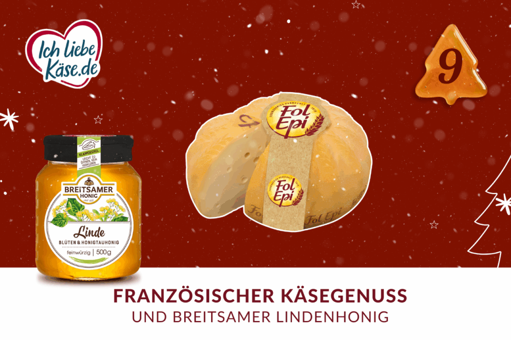 Am neunten Tag unseres Adventskalenders gibt es etwas Besonderes für Sie zu gewinnen: Wir verlosen mit unserem Partner Ich liebe Käse einen Fol Epi Thekenlaib – ein mild-nussiger französischer Schnittkäse aus Kuhmilch. Ein herrlicher Käsegenuss, der wunderbar mit der Süße des Honigs harmoniert. Dazu gibt es unseren Breitsamer Lindenhonig – charakterstark, fein-herb mit einer leicht minzig-zitronigen Note. Gemeinsam sorgen Käse und Honig für besondere Genussmomente, die den Advent versüßen.