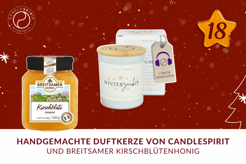 Am 18. Tag unseres Adventskalenders erwarten Sie stimmungsvolle Wintermomente. Die handgegossene Winterzauber-Duftkerze von Candle Spirit verströmt den Duft von Winterwald und Weihnachtsgewürzen, sorgt mit einer kleinen Audio-Meditation für Ruhe und Entspannung. Ergänzt wird dieses besondere Geschenk durch unseren feinen Breitsamer Kirschblütenhonig aus dem Piemont, der mit seiner Mandel- und Marzipan-Note genussvolle Momente bereitet.