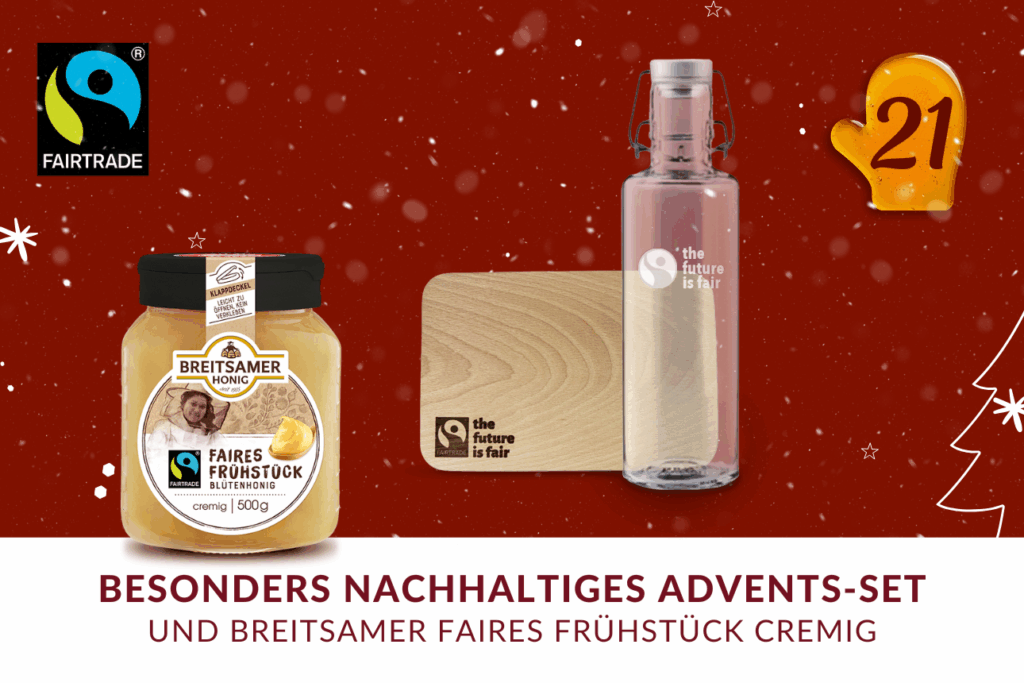Am einundzwanzigsten Tag unseres Adventskalenders wartet ein besonders nachhaltiges Set auf Sie: Unser Partner Fairtrade schenkt eine 1 l Soulbottle aus Deutschland und ein FSC‑zertifiziertes Frühstücksbrettchen, beide gebrandet mit „the future is fair“ und gemeinsam im Wert von ca. 50 €.