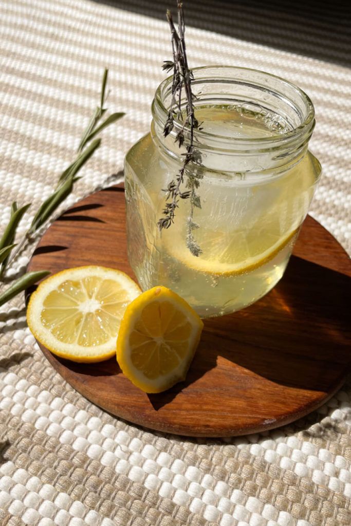 fertige Honig-Kräuterlimonade im Breitsamer Wabenglas auf einem Holzbrett. Neben dem Limonadenglas liegen zwei Scheiben Zitrone.